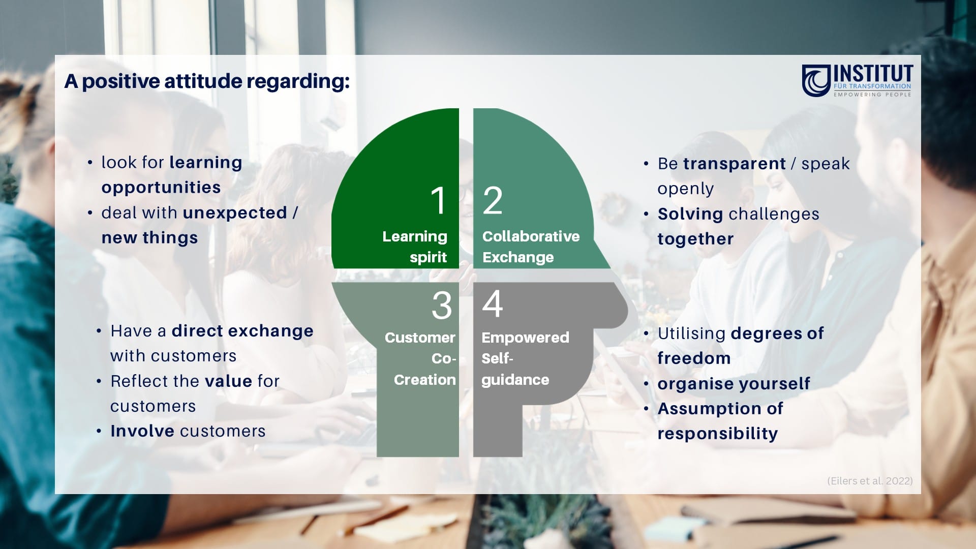 An interesting perspective on this is offered by research into the Agile Mindset. Eilers, Peters, and Leimeister (2022) focused their research on demystifying the Agile Mindset. Based on previous literature and expert interviews, they identified four dimensions of the Agile Mindset to make this attitude more tangible for practice. The Agile Mindset, therefore, represents a positive attitude towards: