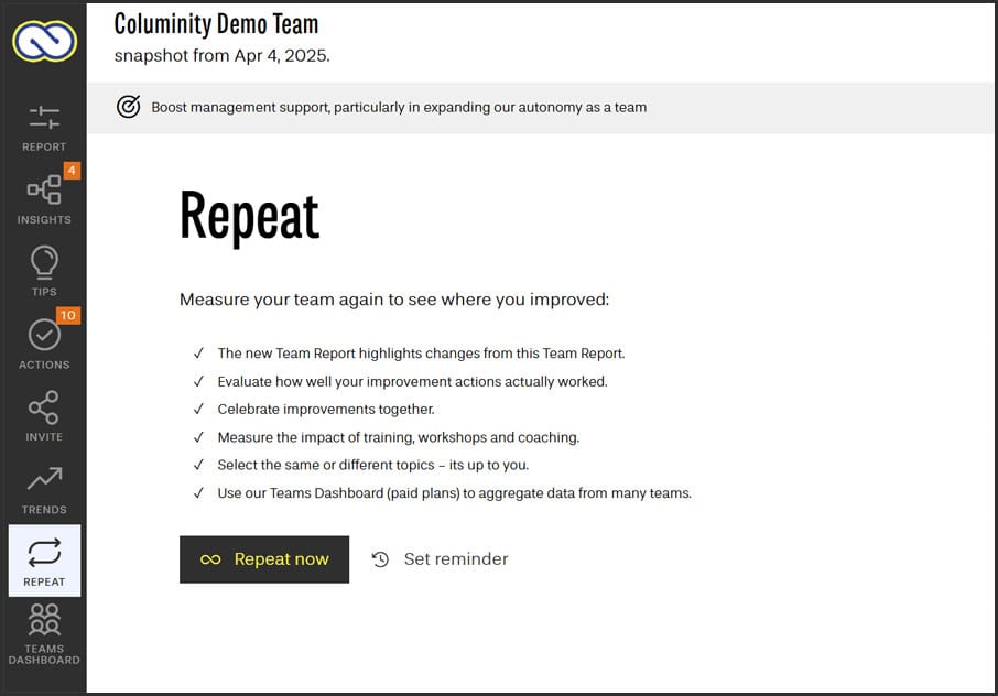 The process above can be initiated at any time for new teams. If your team has already taken a scan before, you can use the "Repeat"-option in the Team Report of the team to set up a new scan for this team. This allows you to see the improvements since the previous scan: