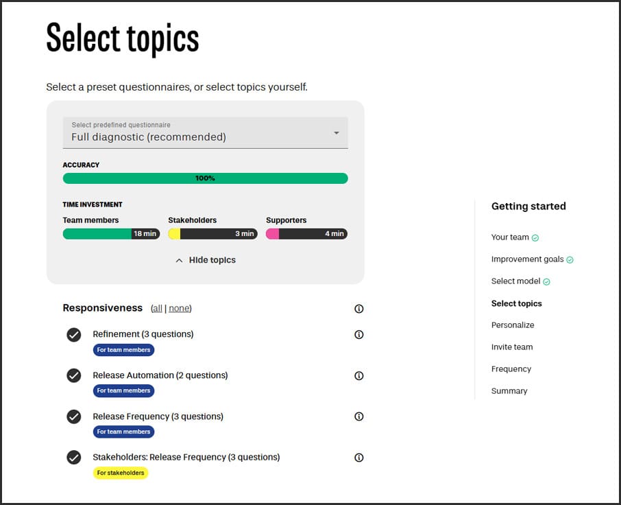 - Continue to the "Select topics" step. Here, you can either select a preset scan or customize the topics by selecting only those you wish to include. Each topic has an information icon next to it to provide some background information, which may help in your decision. Reducing the number of factors inevitably reduces the comprehensives of the scan, so the wizard always shows the trade-off in accuracy with the time investment of the various groups you can invite.