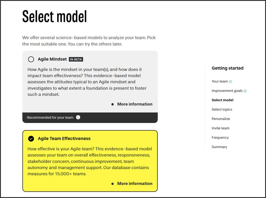 - Continue through the wizard until you reach the "Select model" step. The available topics depend on the scientific model you choose. Each model has its focus, and is more or less suitable depending on your improvement aims. You can always go back and change models until you actually start the scan (after "Summary").